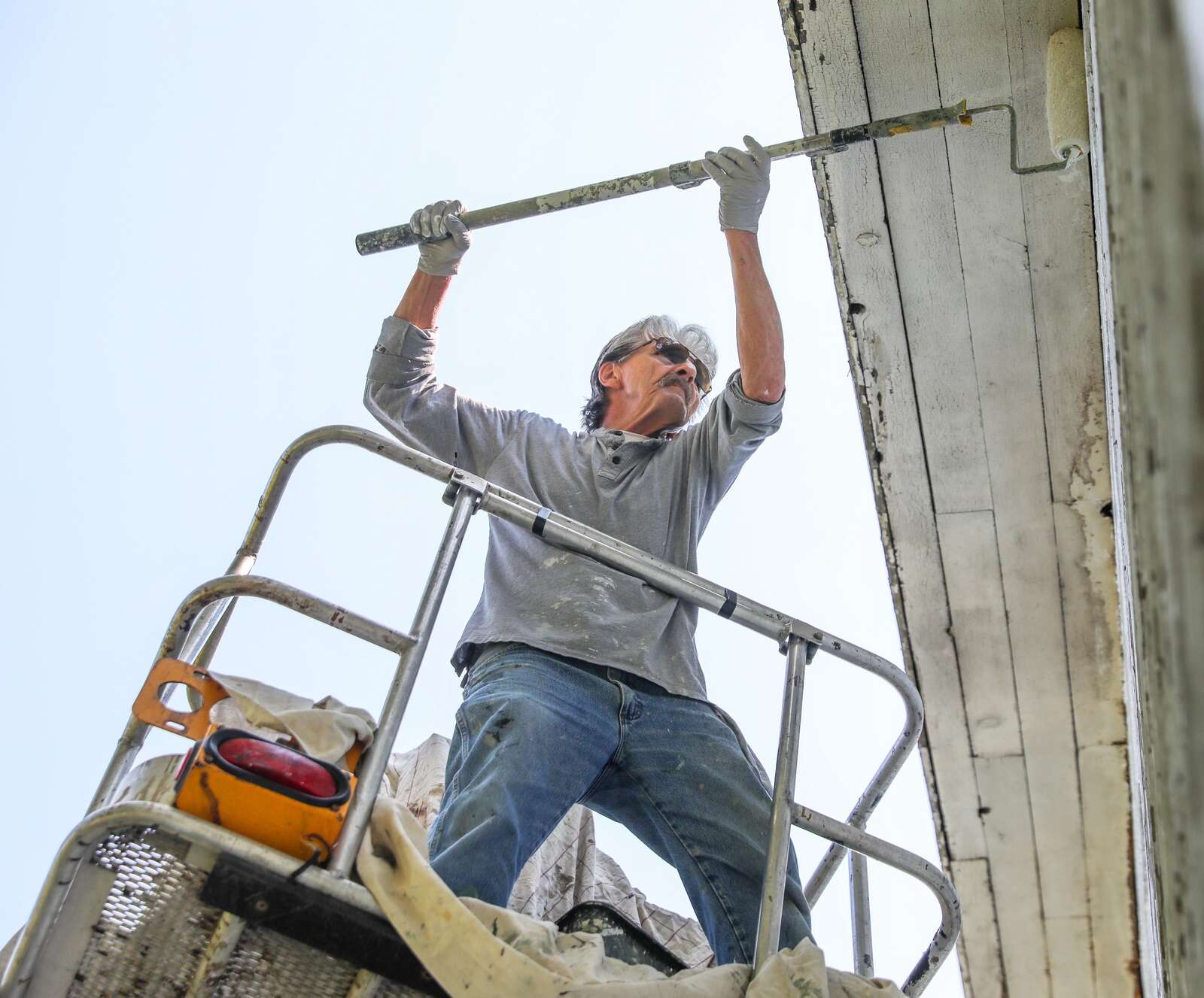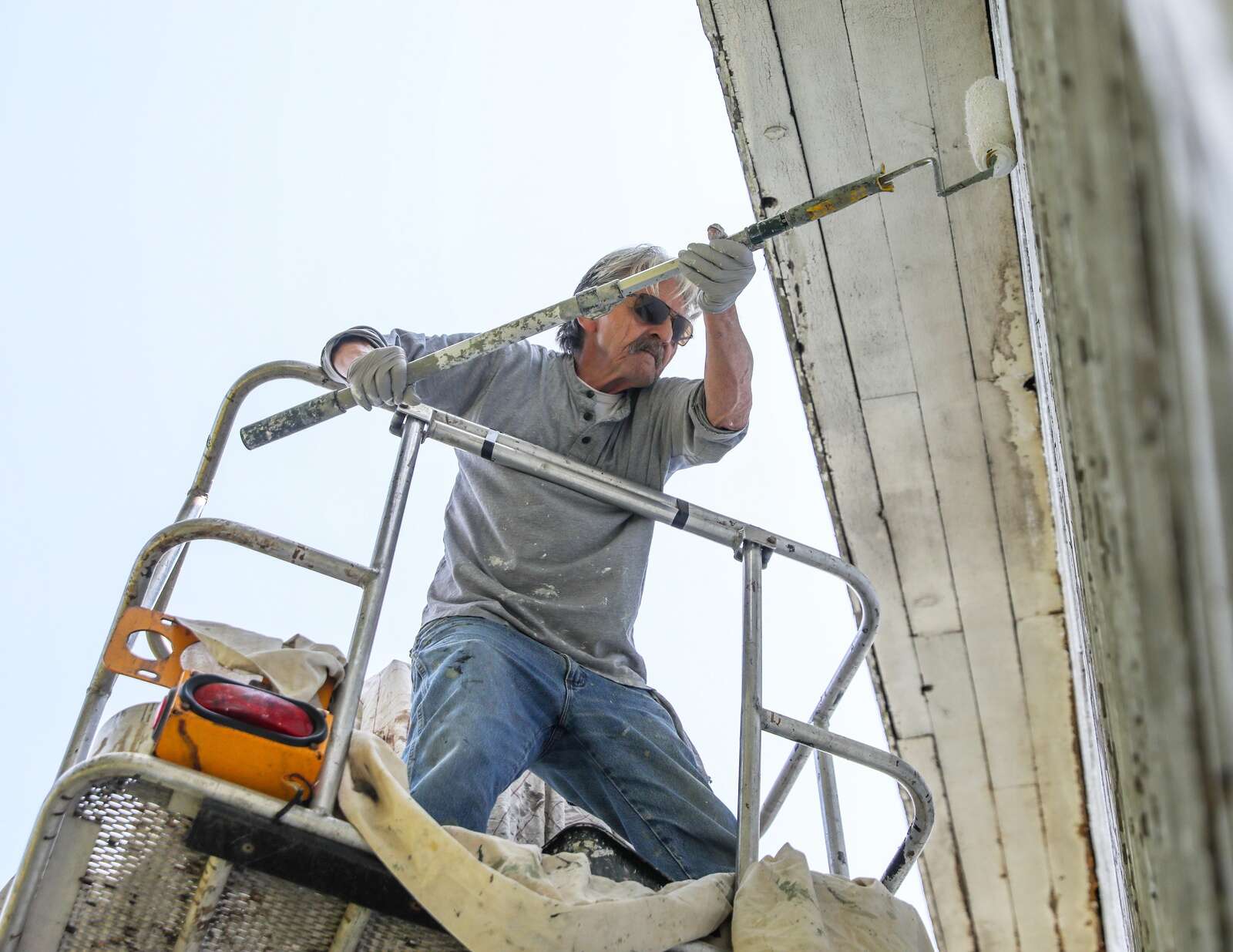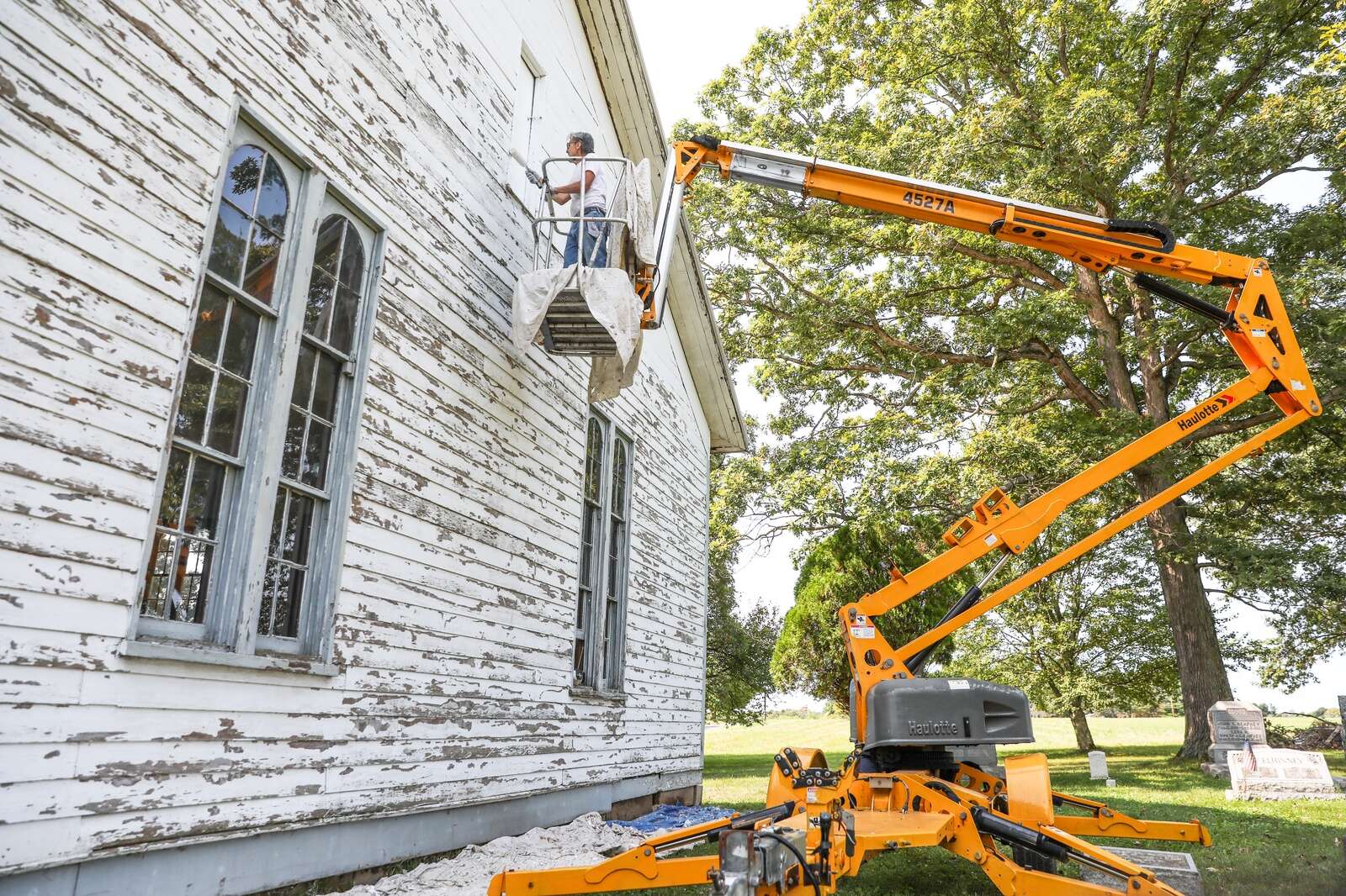 Volunteer Bob Bower paints North Union Church from a lift during a restoration project at the church on Wednesday, Sept. 4. Morgan Phillips/Butler Eagle