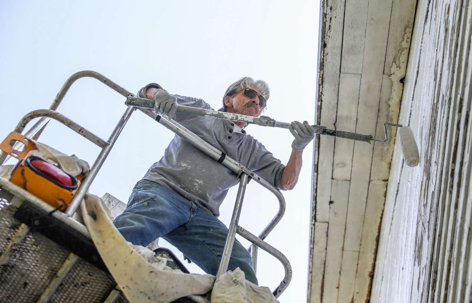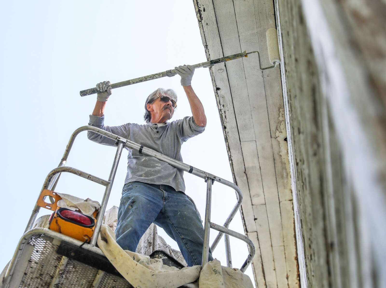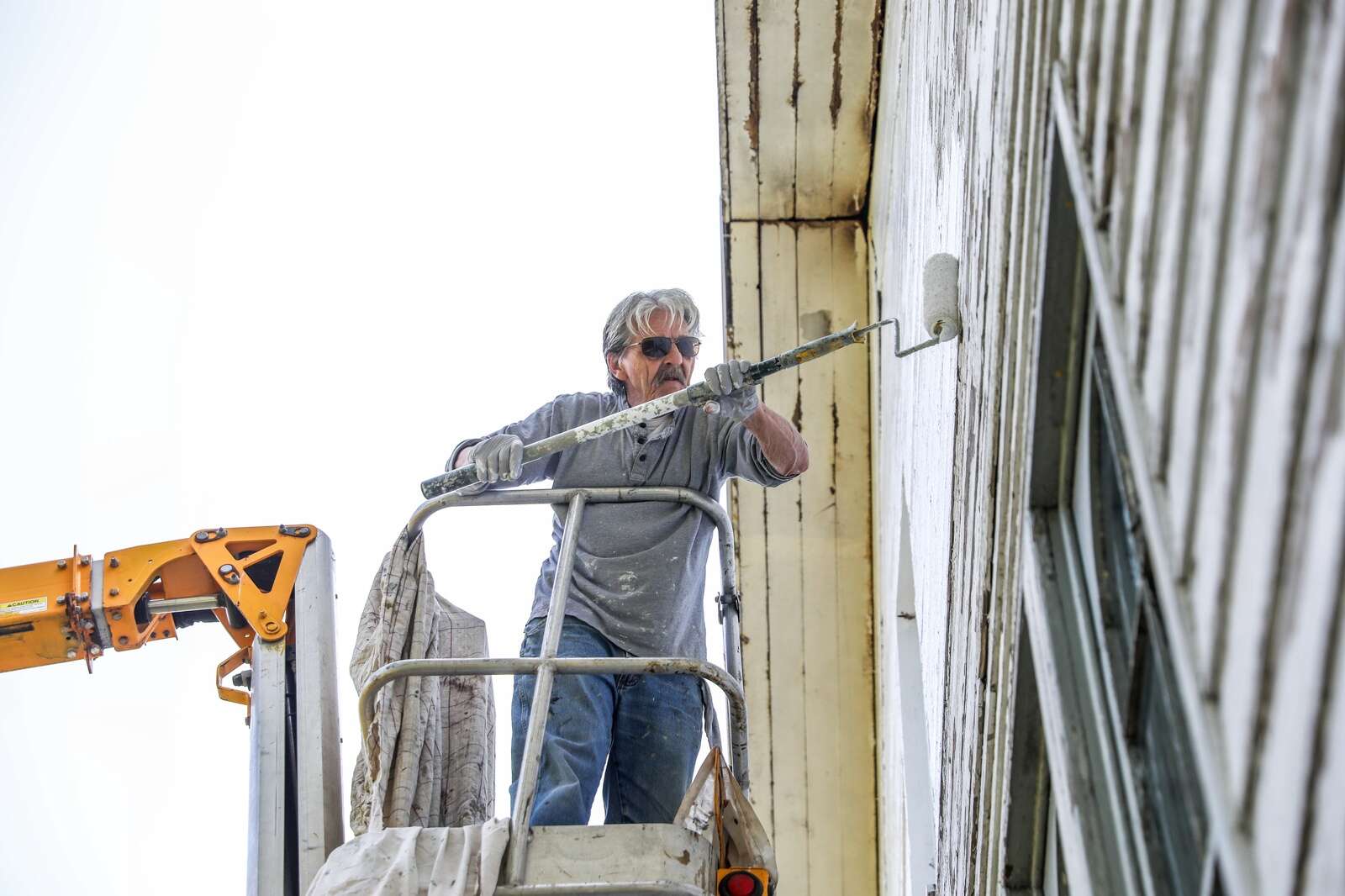 Volunteer Bob Bower paints North Union Church from a lift during a restoration project at the church on Wednesday, Sept. 4. Morgan Phillips/Butler Eagle