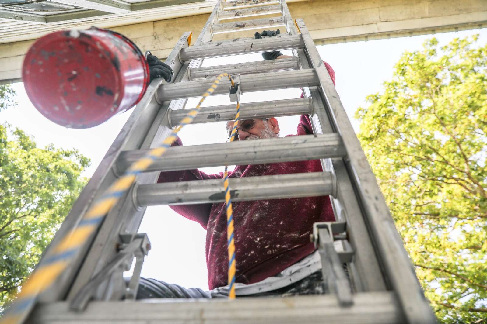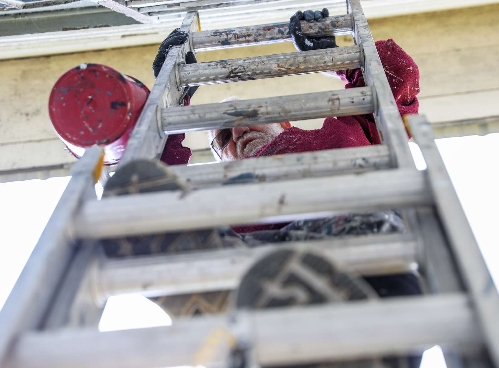 One of the people painting the church Wednesday was Evans City Mayor Dean Zinkhann, who is also a member of the Evans City Historical Society. Zinkhann helped recruit painters but didn’t skimp on the painting himself, as he spoke from the top of a ladder extended to the church’s upper third.