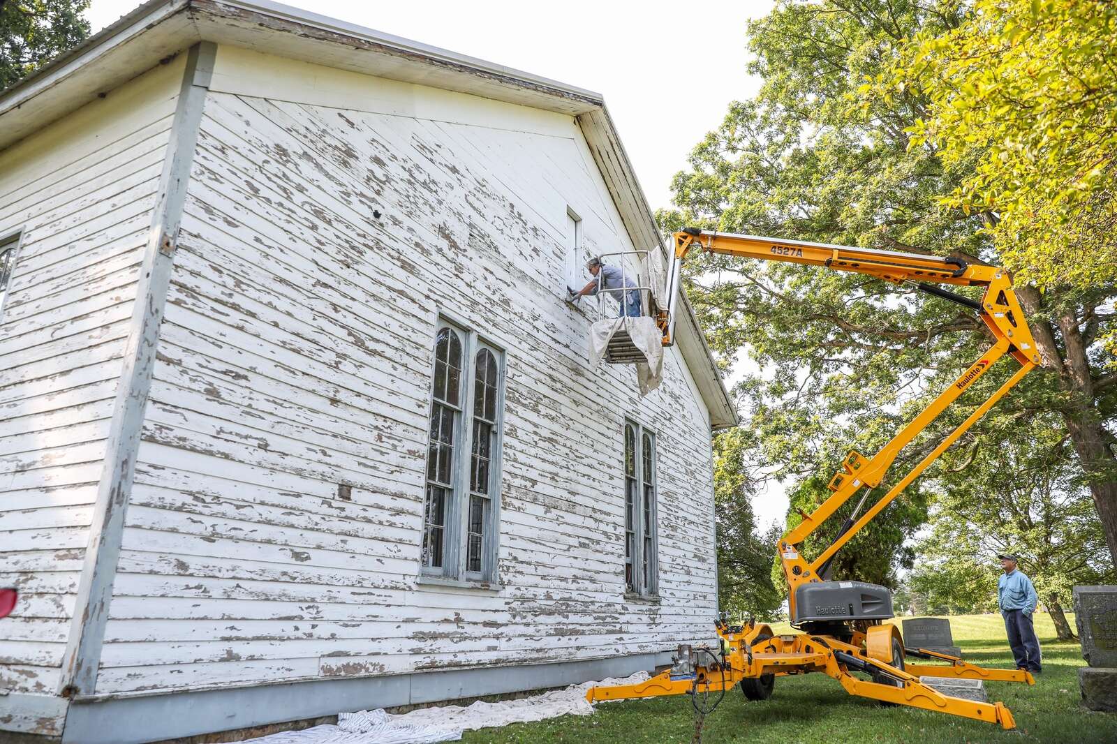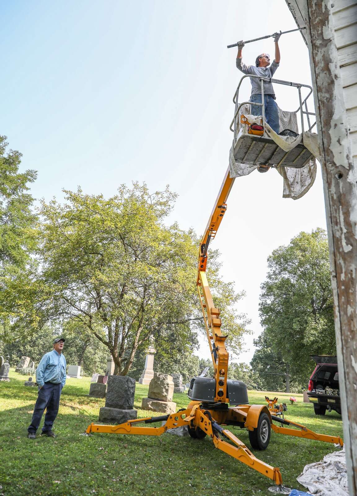 Bob Bower paints North Union Church with the help of a lift, which is being operated by Bob Grant, during a restoration project at the church on Wednesday, Sept. 4. Morgan Phillips/Butler Eagle