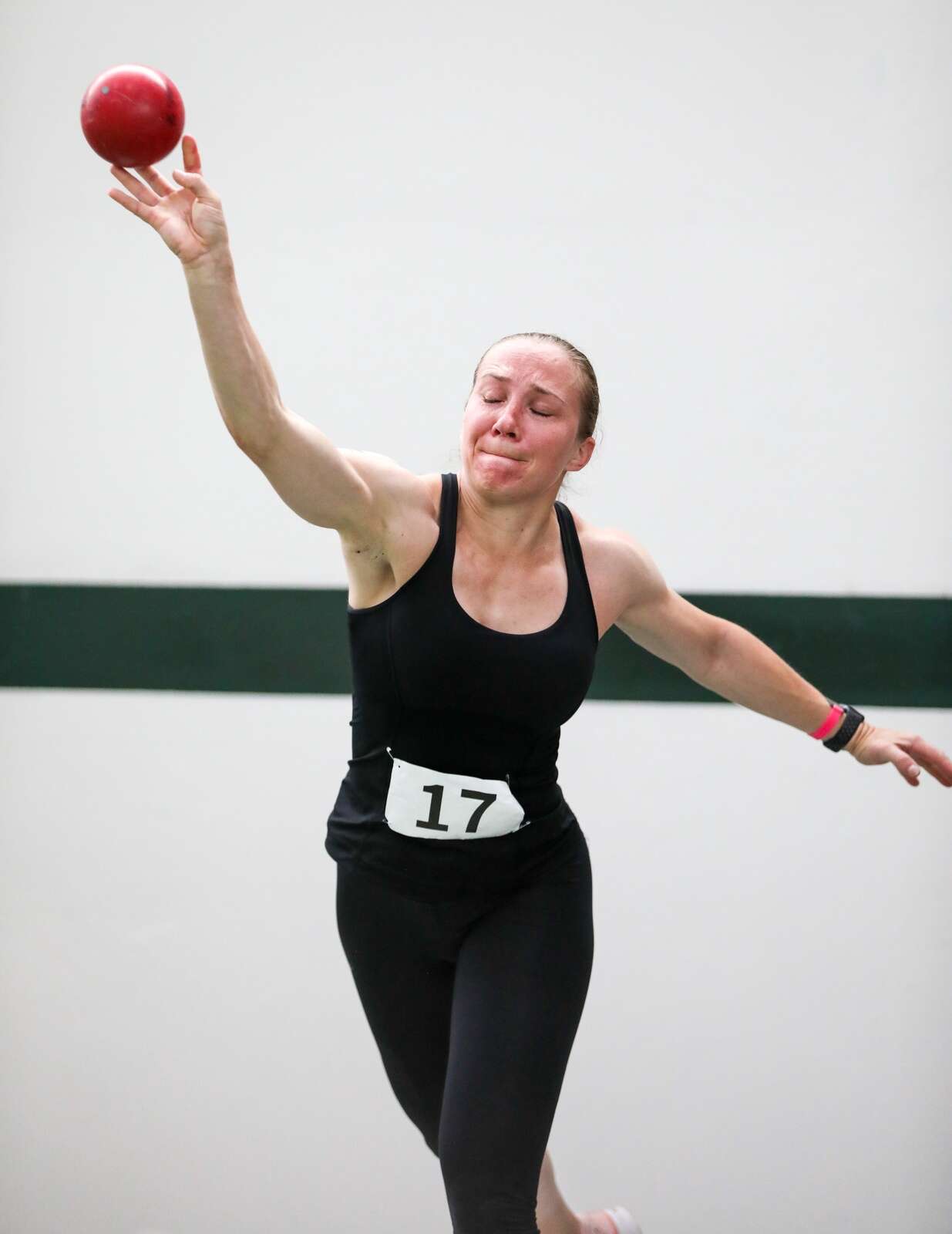 Kate Galamiyeva competes in the shot put portion of the Toughest Competitor Alive event in the 2024 Can-Am Police-Fire Games at Morrow Fieldhouse at Slippery Rock University on Saturday, July 20. Morgan Phillips/Butler Eagle