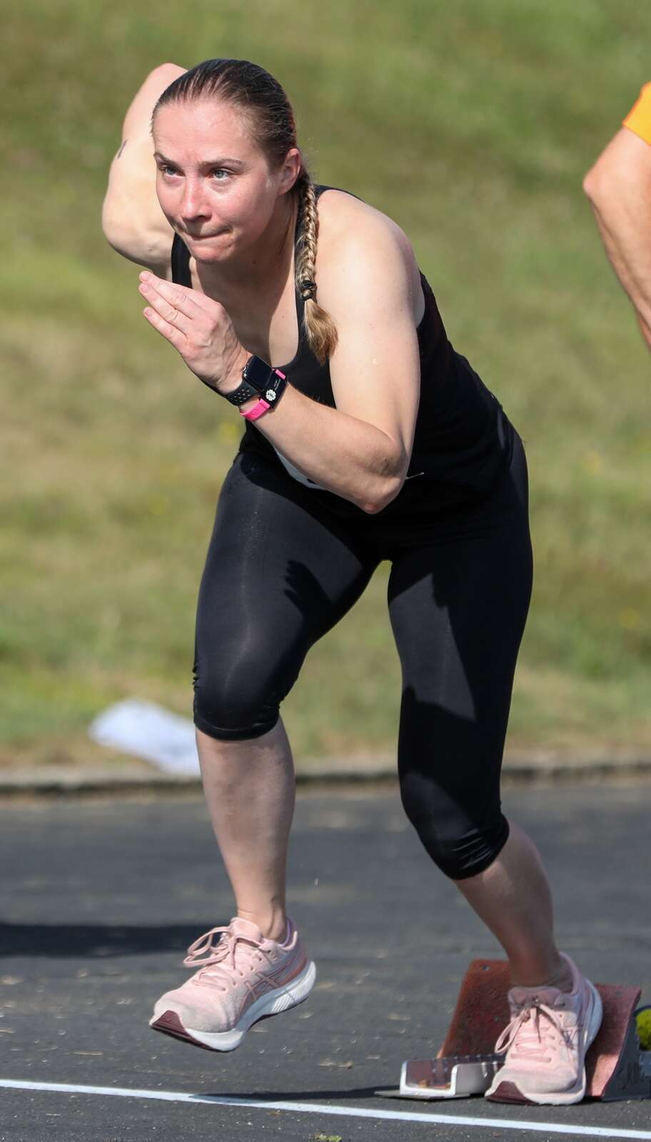 Kate Galamiyeva takes her mark ahead of the 100-meter sprint portion of the Toughest Competitor Alive event in the 2024 Can-Am Police-Fire Games at Morrow Fieldhouse at Slippery Rock University on Saturday, July 20. Morgan Phillips/Butler Eagle