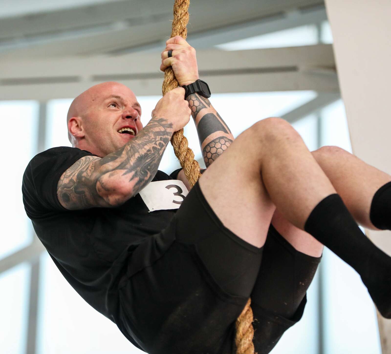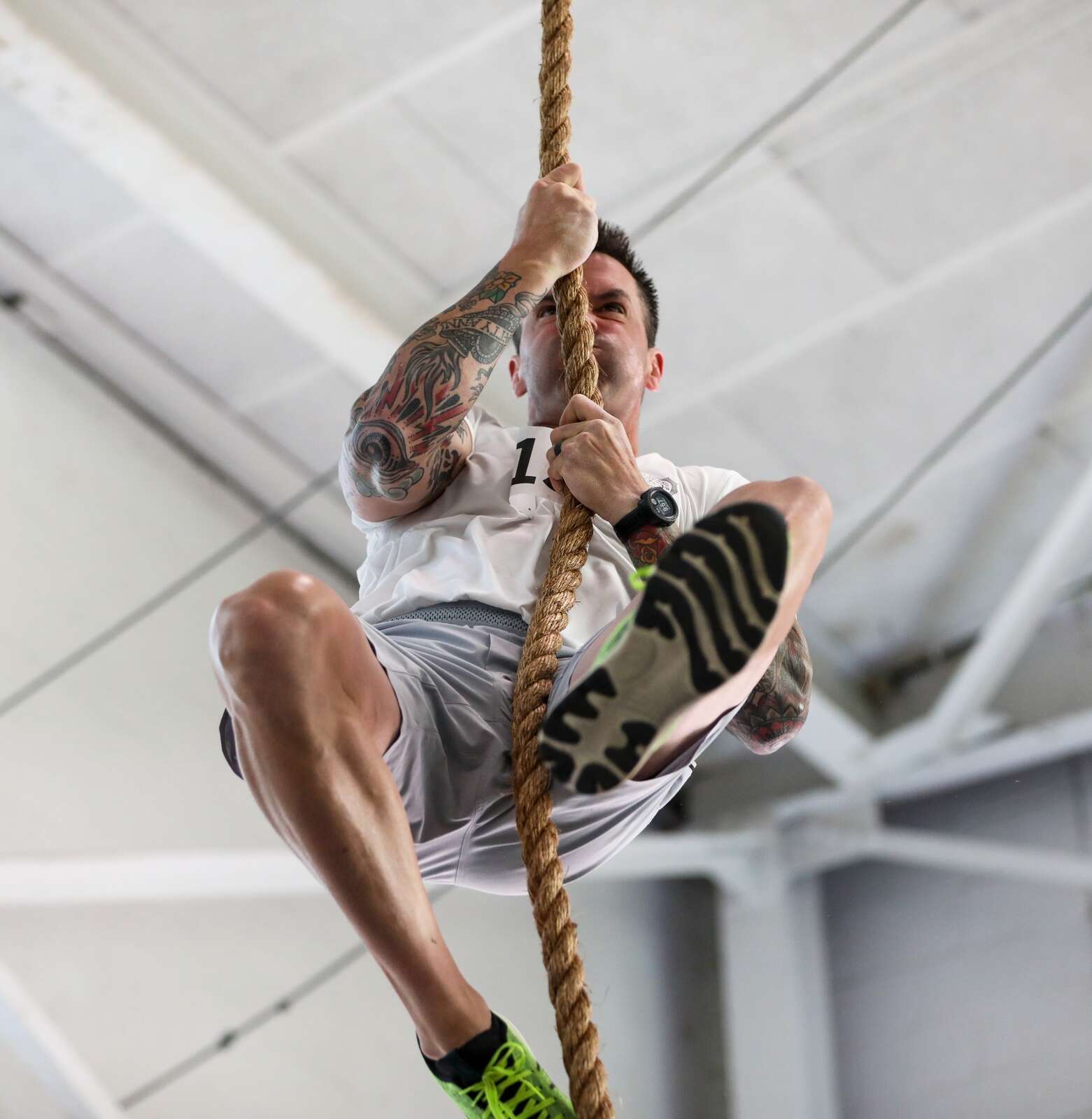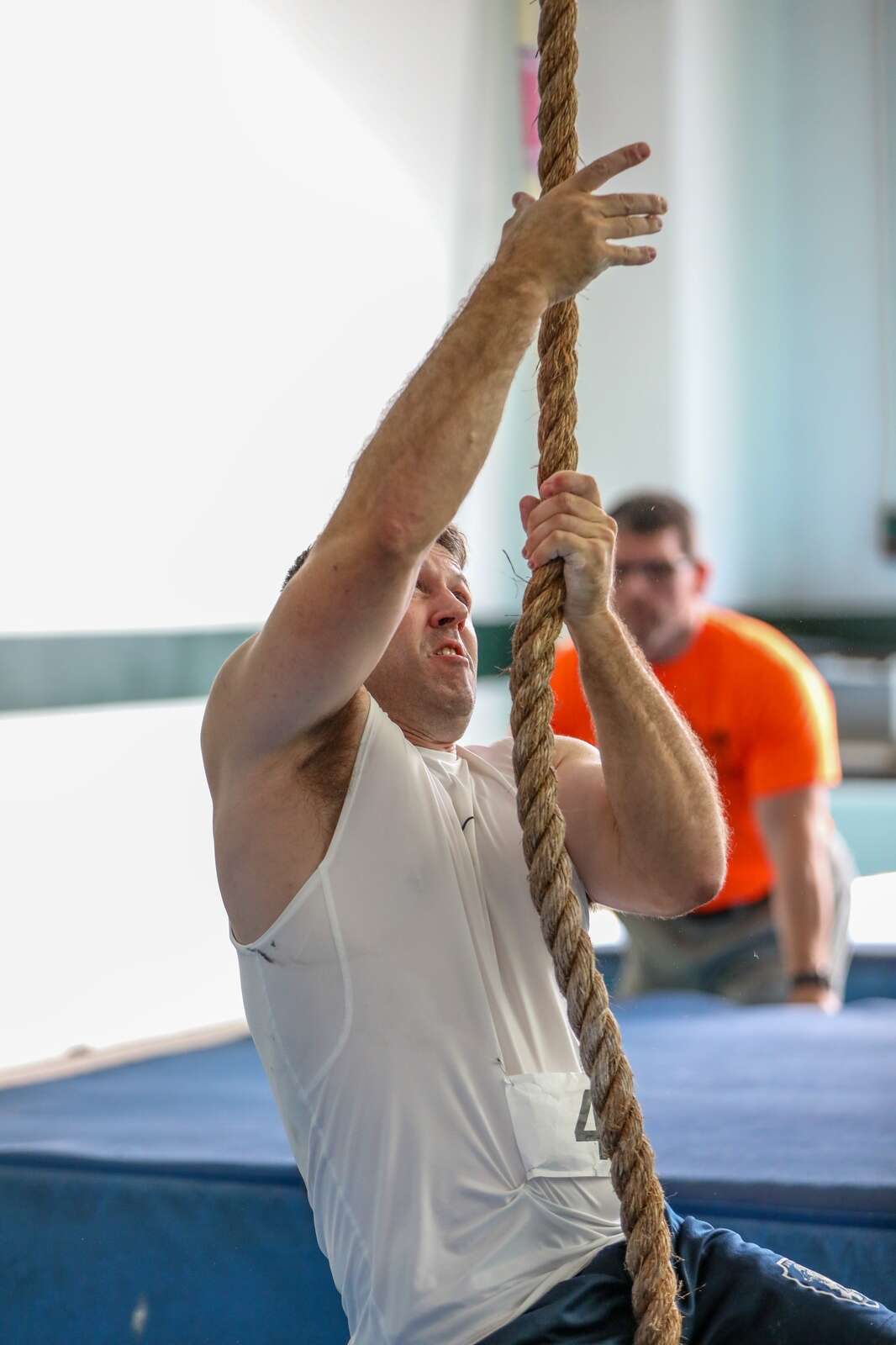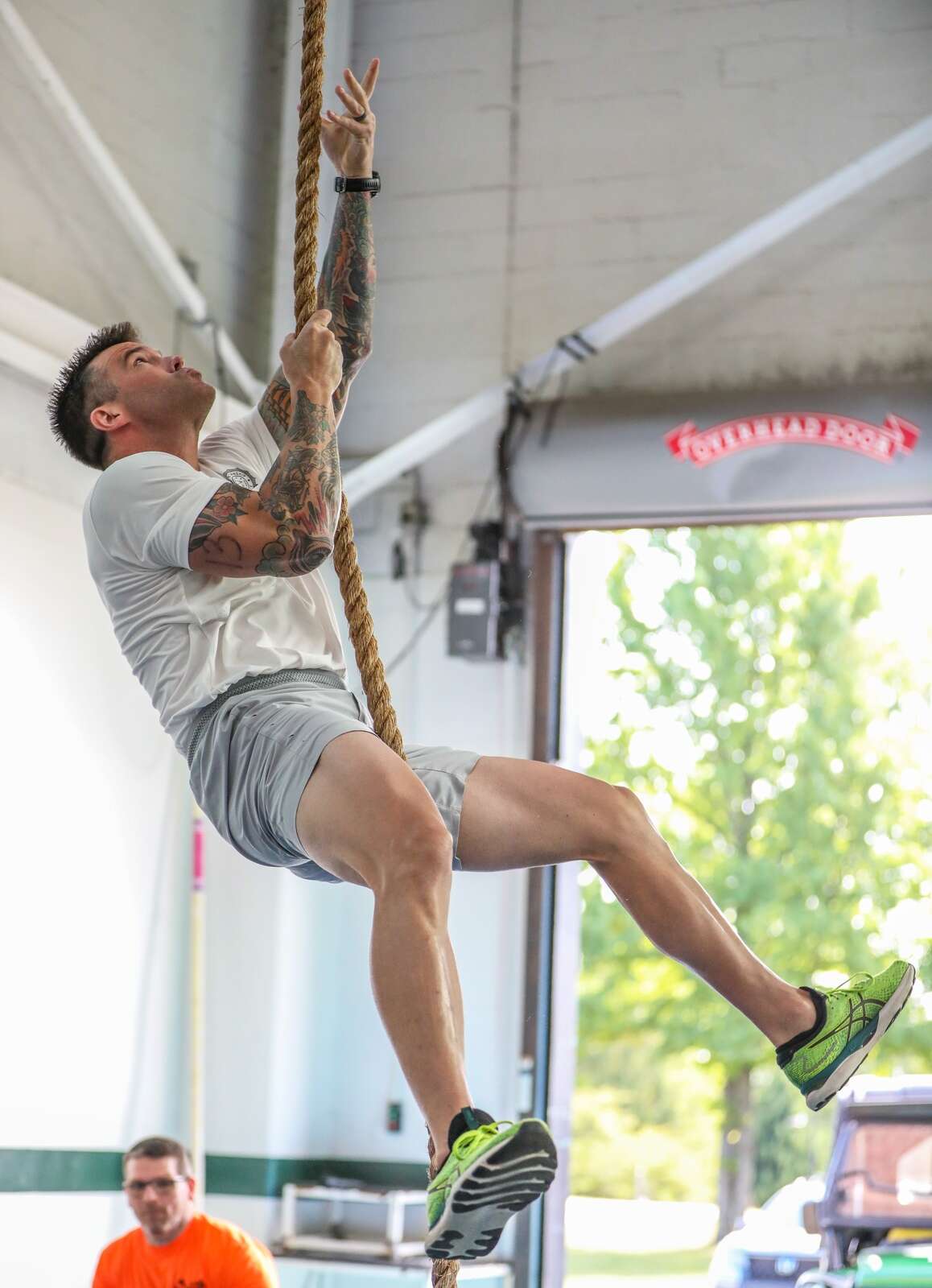 Christopher Krouse competes in the rope climbing portion of the Toughest Competitor Alive event in the 2024 Can-Am Police-Fire Games at Morrow Fieldhouse at Slippery Rock University on Saturday, July 20. Morgan Phillips/Butler Eagle