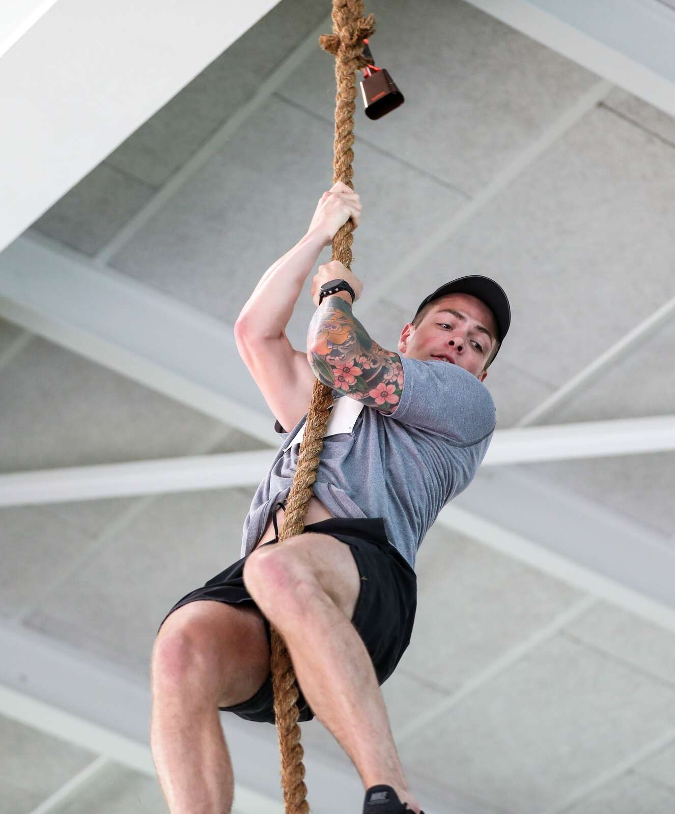 Bryce Foreback competes in the rope climbing portion of the Toughest Competitor Alive event in the 2024 Can-Am Police-Fire Games at Morrow Fieldhouse at Slippery Rock University on Saturday, July 20. Morgan Phillips/Butler Eagle