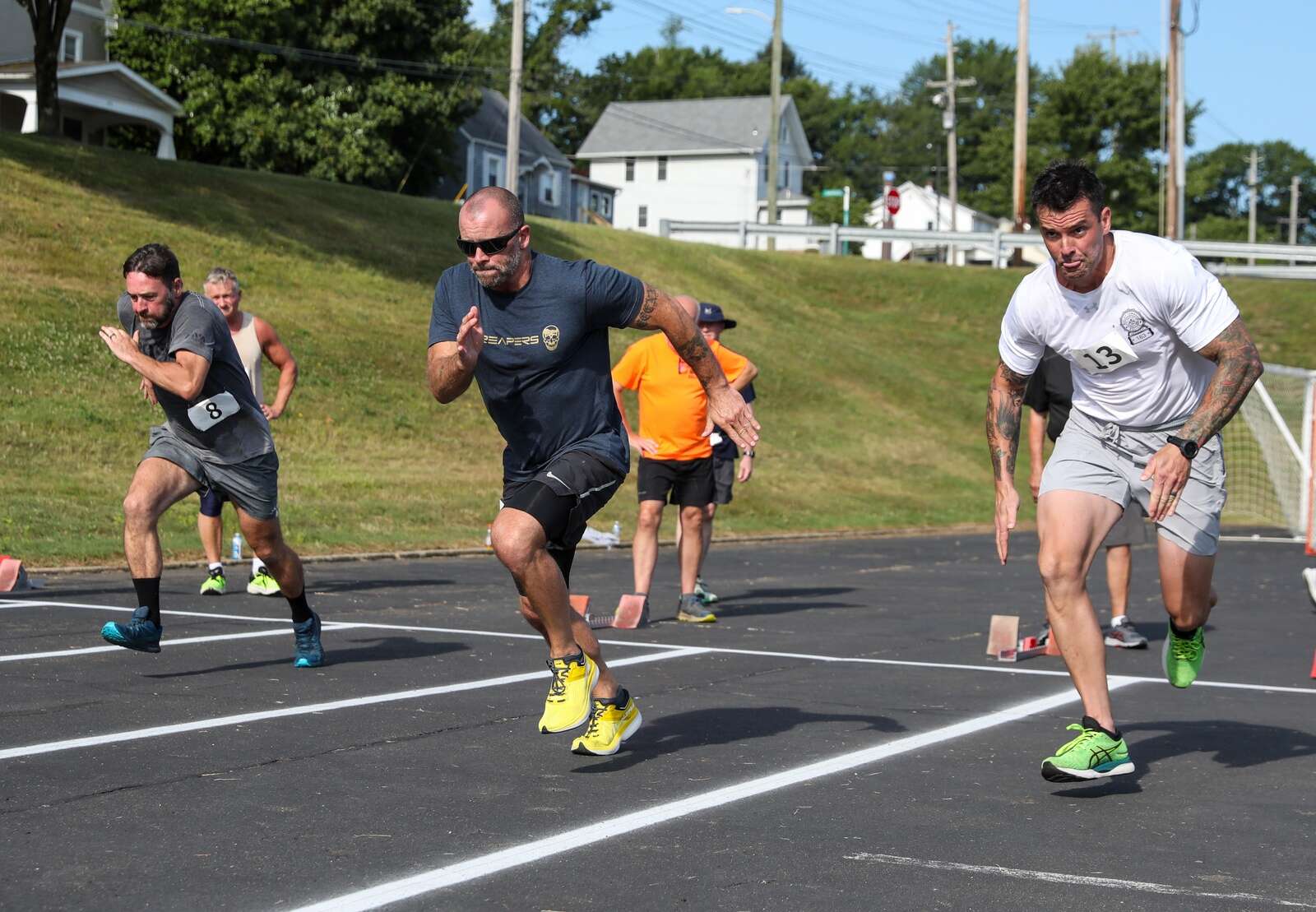 Christopher Krouse, left, Christopher Harper and Dylan Pizzacalla race in the 100-meter sprint portion of the Toughest Competitor Alive event in the 2024 Can-Am Police-Fire Games at Morrow Fieldhouse at Slippery Rock University on Saturday, July 20. Morgan Phillips/Butler Eagle