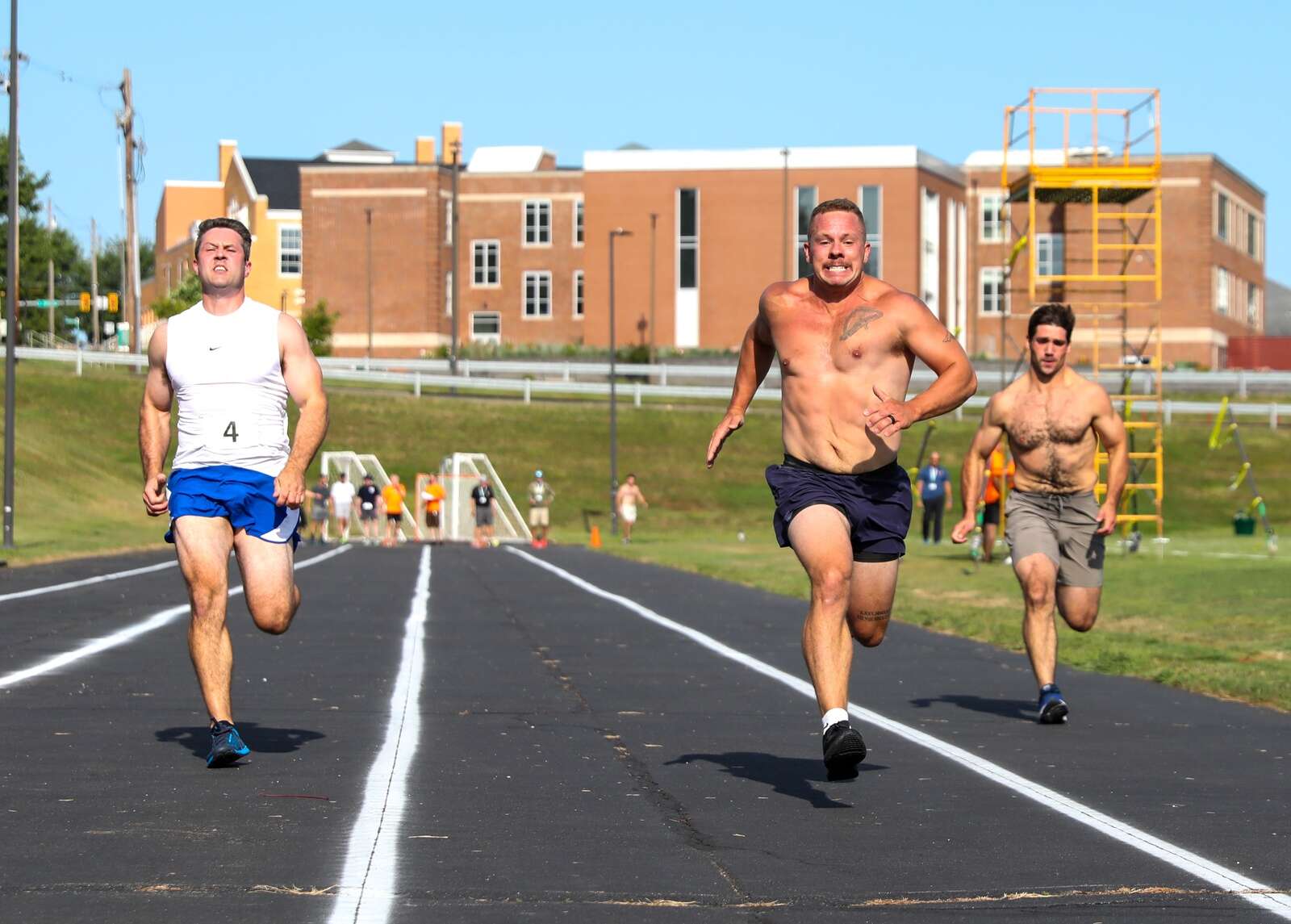 From left, Bruce Dale, Ryan Victory and Mathew Rowan race in the 100-meter sprint portion of the Toughest Competitor Alive event in the 2024 Can-Am Police-Fire Games at Morrow Fieldhouse at Slippery Rock University on Saturday, July 20. Morgan Phillips/Butler Eagle