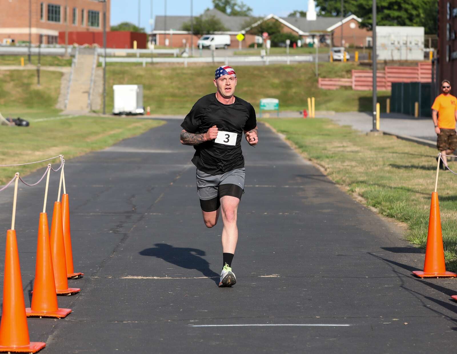 Bryce Foreback is the first runner to cross the finish line in the 5K portion of the Toughest Competitor Alive event in the 2024 Can-Am Police-Fire Games at Morrow Fieldhouse at Slippery Rock University on Saturday, July 20. Morgan Phillips/Butler Eagle