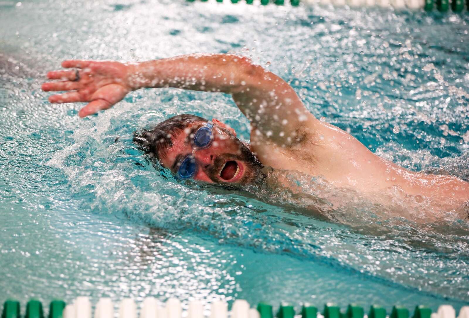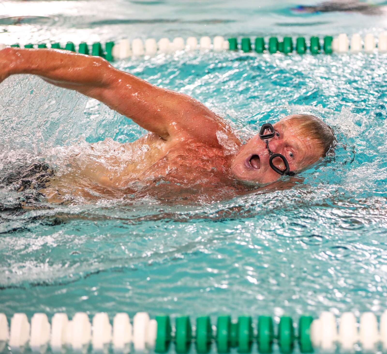 Bruce Dale competes in the 100-meter swim during the Toughest Competitor Alive event in the 2024 Can-Am Police-Fire Games at Morrow Fieldhouse at Slippery Rock University on Saturday, July 20. Morgan Phillips/Butler Eagle