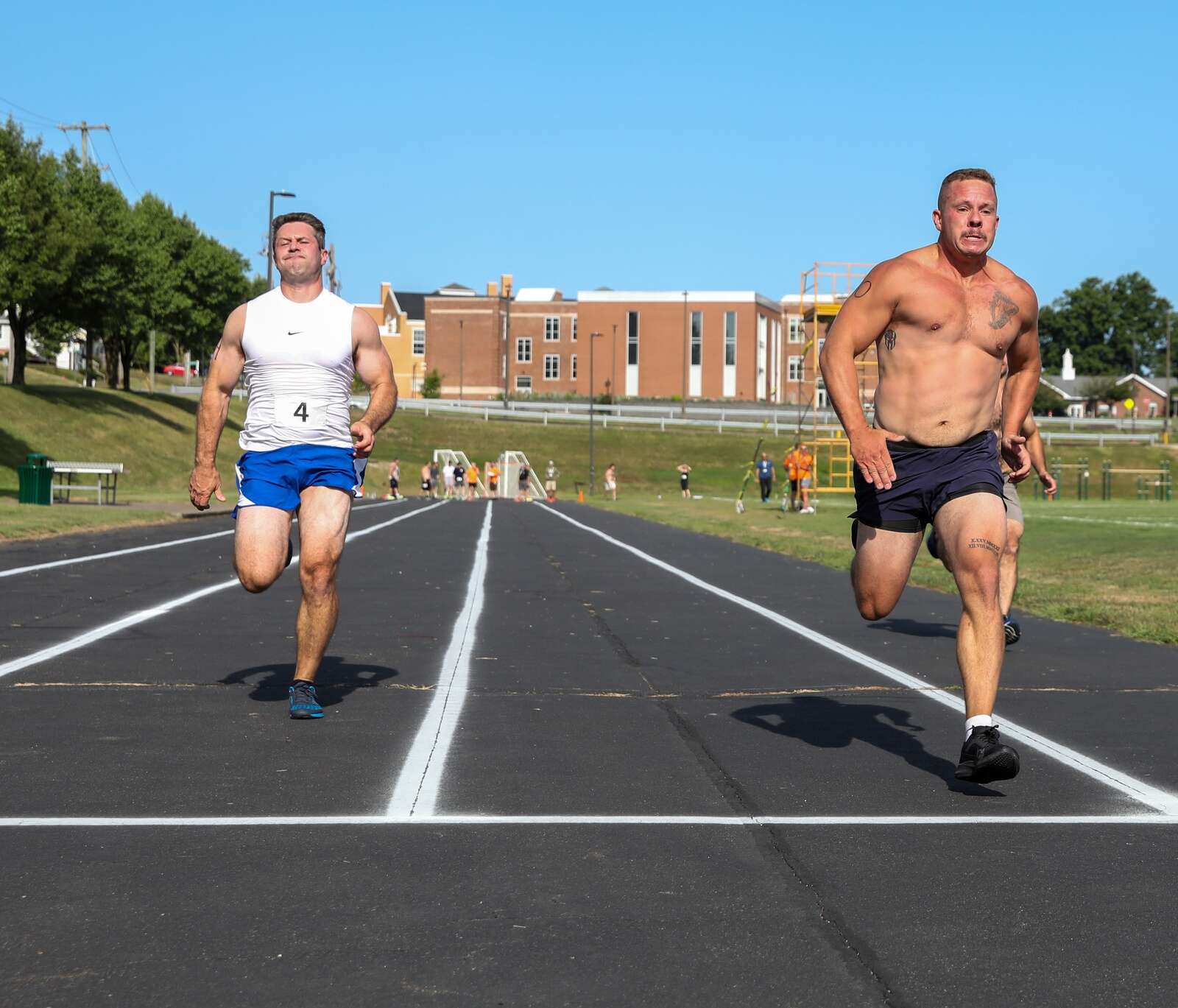 From left, Christopher Krouse and Christopher Harper race in the 100-meter sprint portion of the Toughest Competitor Alive event in the 2024 Can-Am Police-Fire Games at Morrow Fieldhouse at Slippery Rock University on Saturday, July 20. Morgan Phillips/Butler Eagle