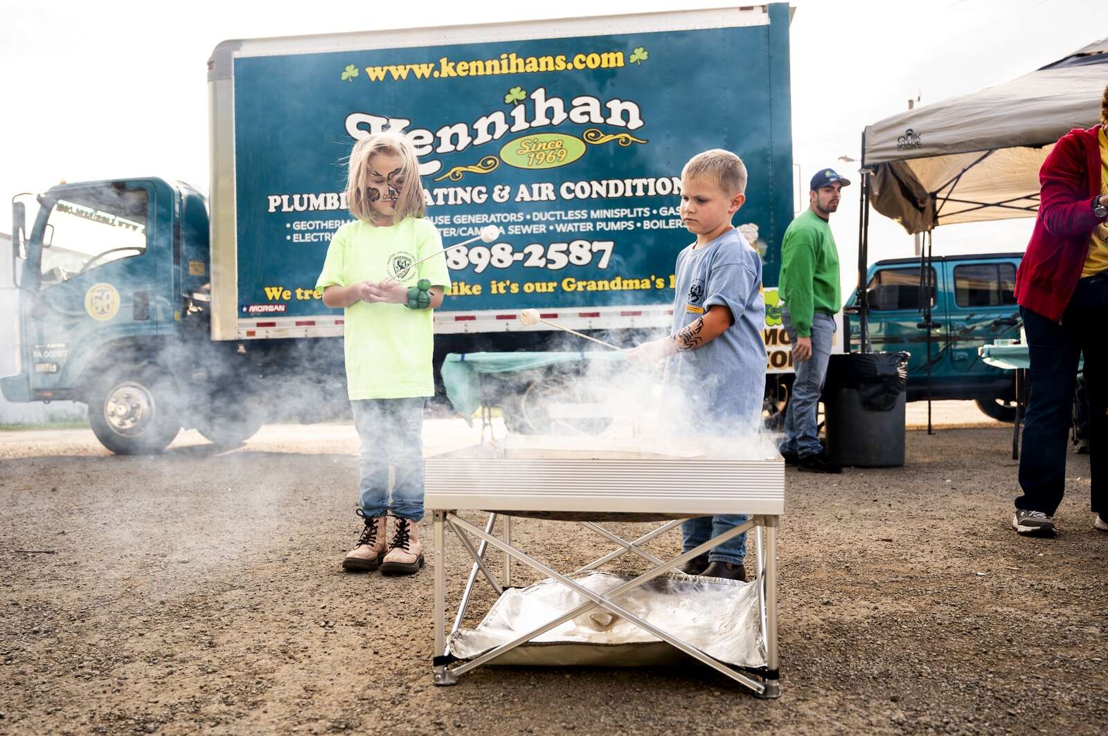 Myles and Mykalena Hemphill cook marshmallows for s'mores during Family Fun Night on Tuesday, Aug. 20, 2024, at the Butler Farm Show grounds in Connoquenessing Township. Rob McGraw/Butler Eagle
