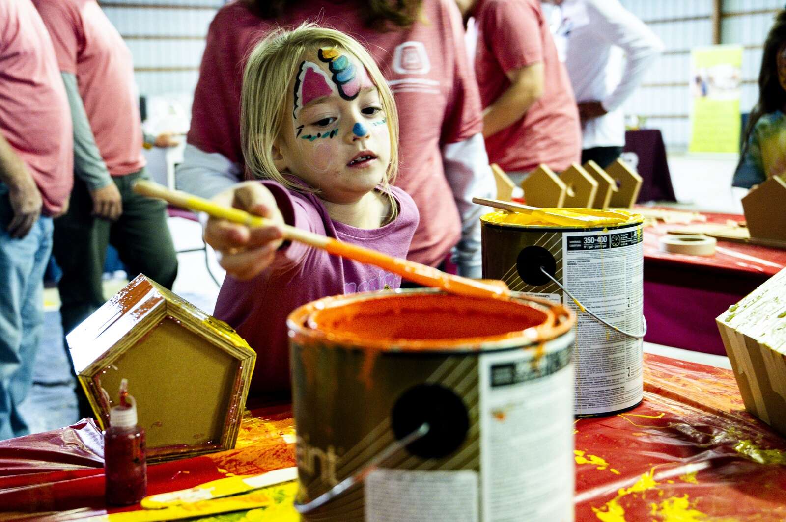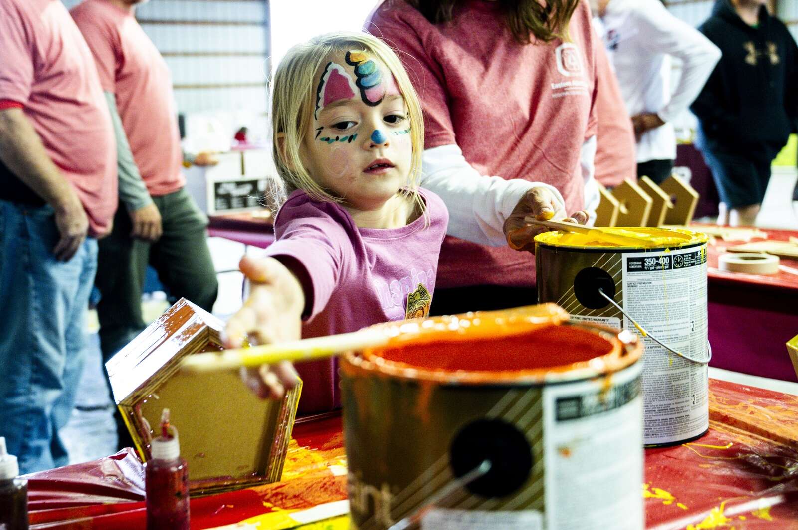 Addy Farster reaches for more orange paint for her miniature house during Family Fun Night on Tuesday, Aug. 20, 2024, at the Butler Farm Show grounds in Connoquenessing Township. Rob McGraw/Butler Eagle
