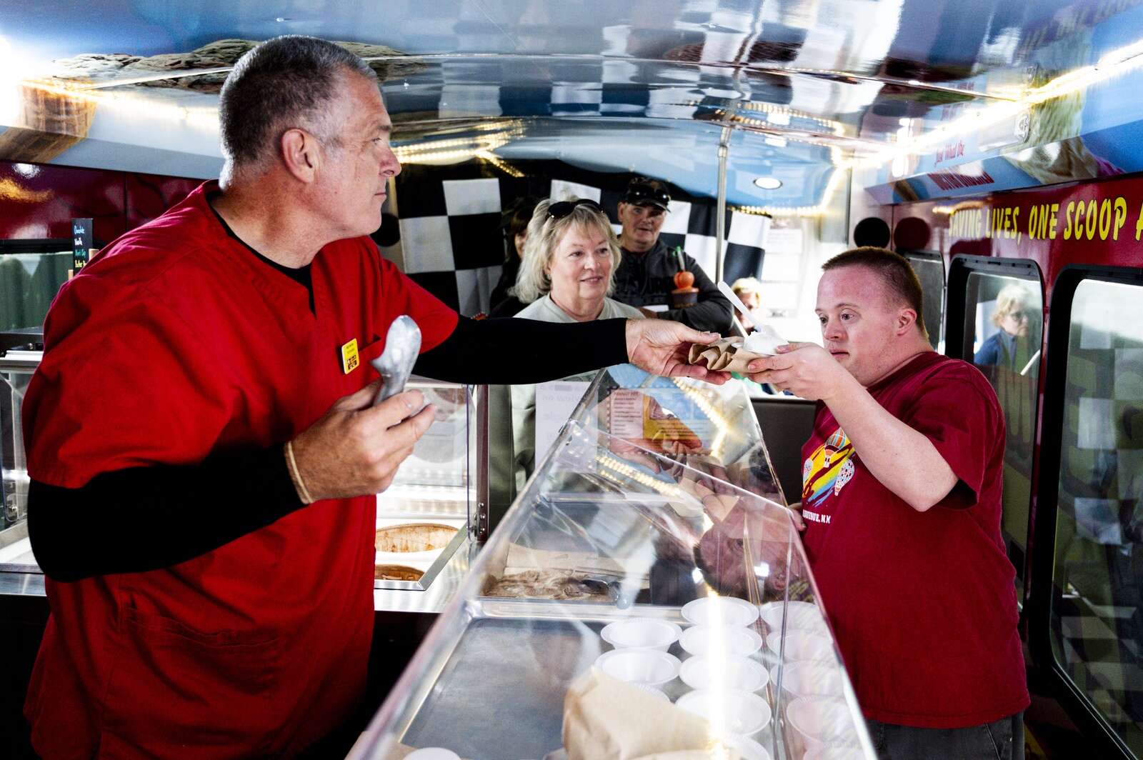 Steven Keck watches as free ice-cream is put into cups to be served to visitors of Family Fun Night on Tuesday, Aug. 20, 2024, at the Butler Farm Show grounds in Connoquenessing Township. Rob McGraw/Butler Eagle