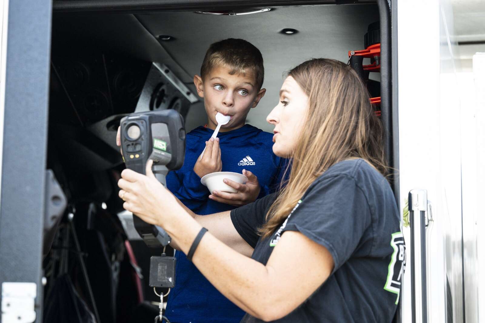 Firefighter Steph Steele-Morrie shows Kemper Rock equipment the local fire department uses during Family Fun Night on Tuesday, Aug. 20, 2024, at the Butler Farm Show grounds in Connoquenessing Township. Rob McGraw/Butler Eagle