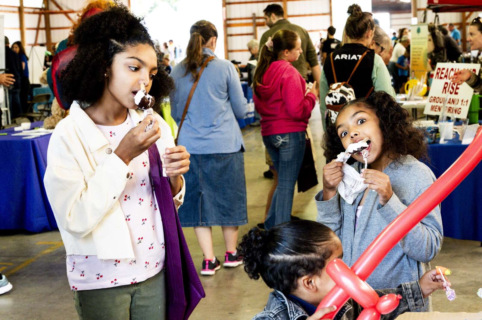 Sisters Rachel (right) and Nicole (left) Brown enjoy ice-cream as they visit different stations of Family Fun Night on Tuesday, Aug. 20, 2024, at the Butler Farm Show grounds in Connoquenessing Township. Rob McGraw/Butler Eagle
