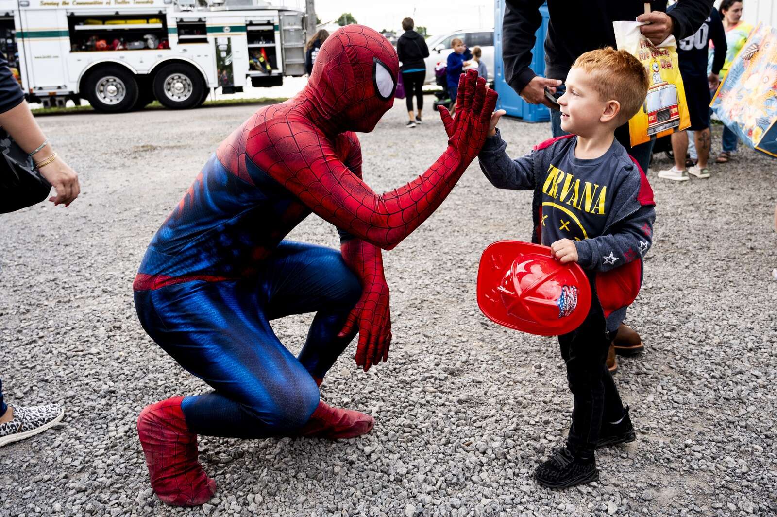 Decker Kramer high-fives Spiderman during Family Fun Night on Tuesday, Aug. 20, 2024, at the Butler Farm Show grounds in Connoquenessing Township. Rob McGraw/Butler Eagle