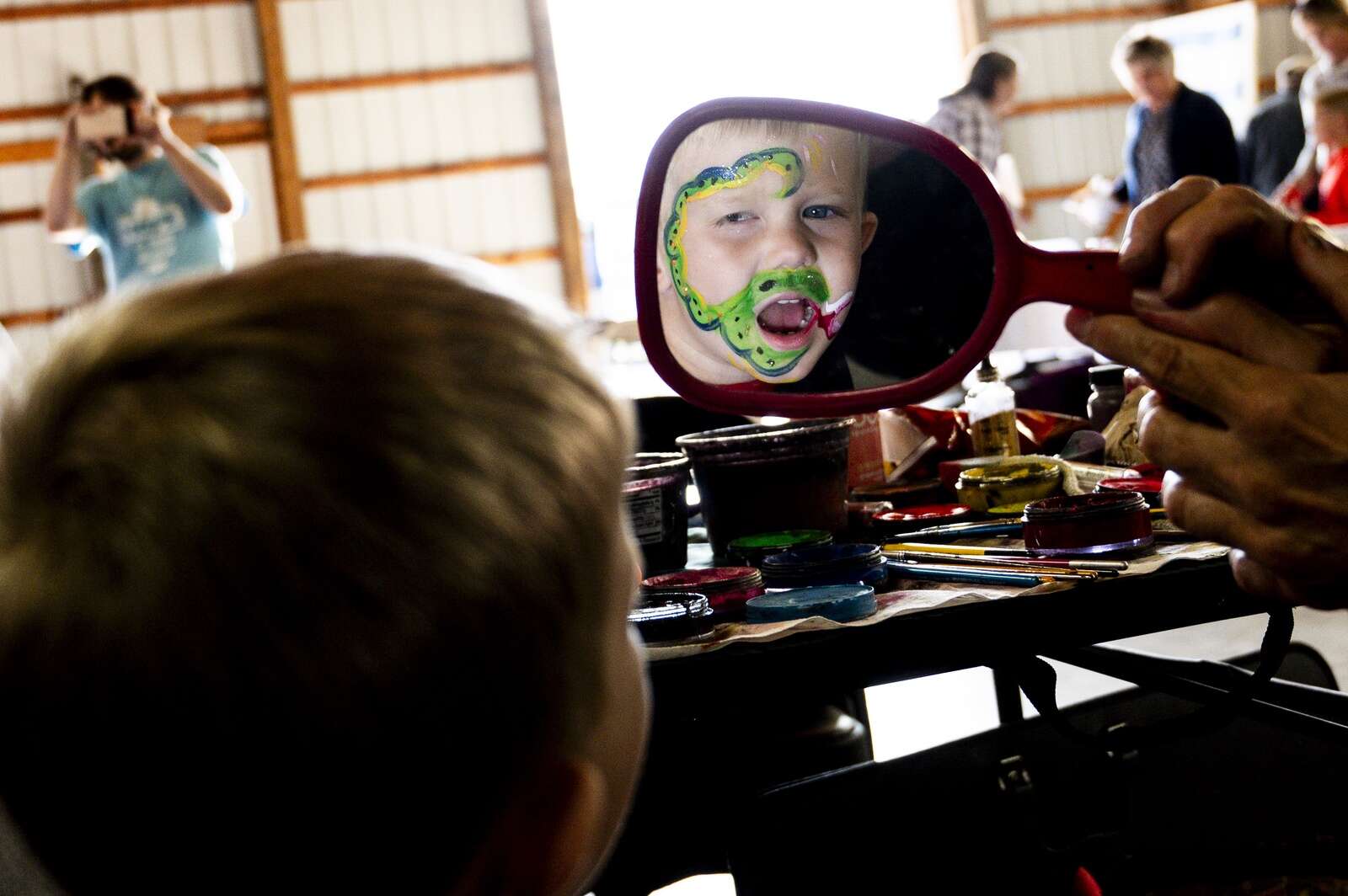 Nicholas Tritch checks out his face painting in the mirror during Family Fun Night on Tuesday, Aug. 20, 2024, at the Butler Farm Show grounds in Connoquenessing Township. Rob McGraw/Butler Eagle
