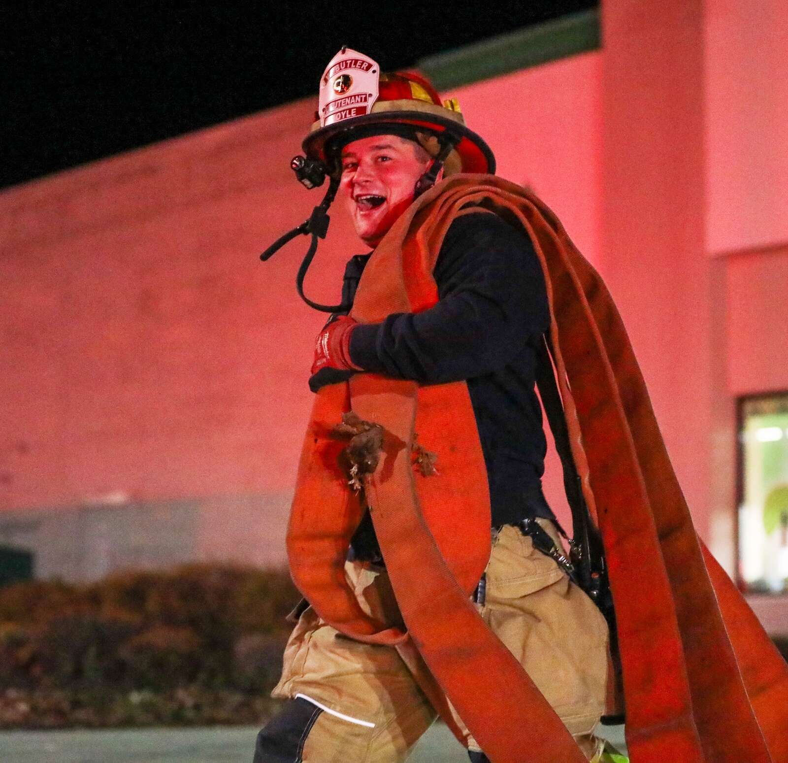 A Butler fireman rolls up a fire hose after a fire department training event at Clearview Mall in Butler on Tuesday, Nov. 26. Morgan Phillips/Butler Eagle