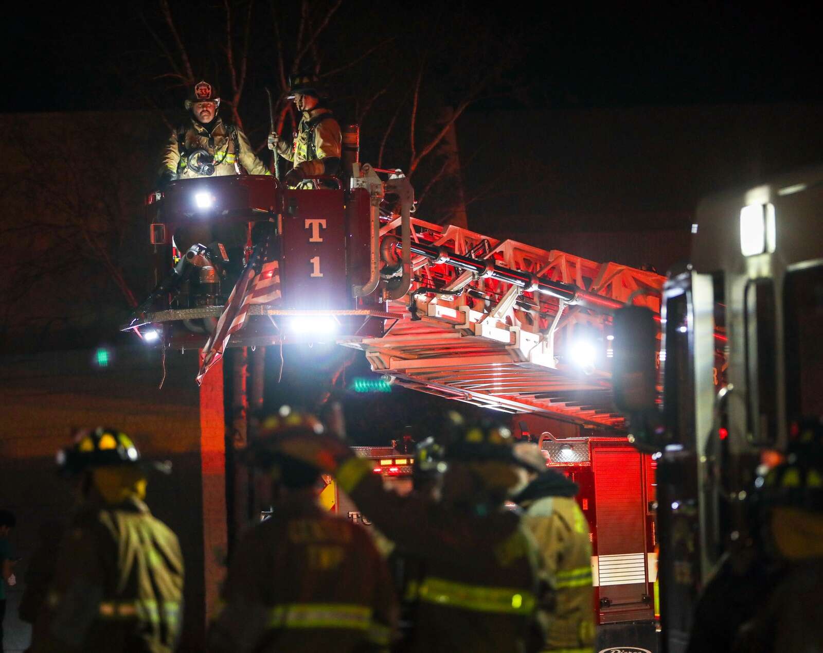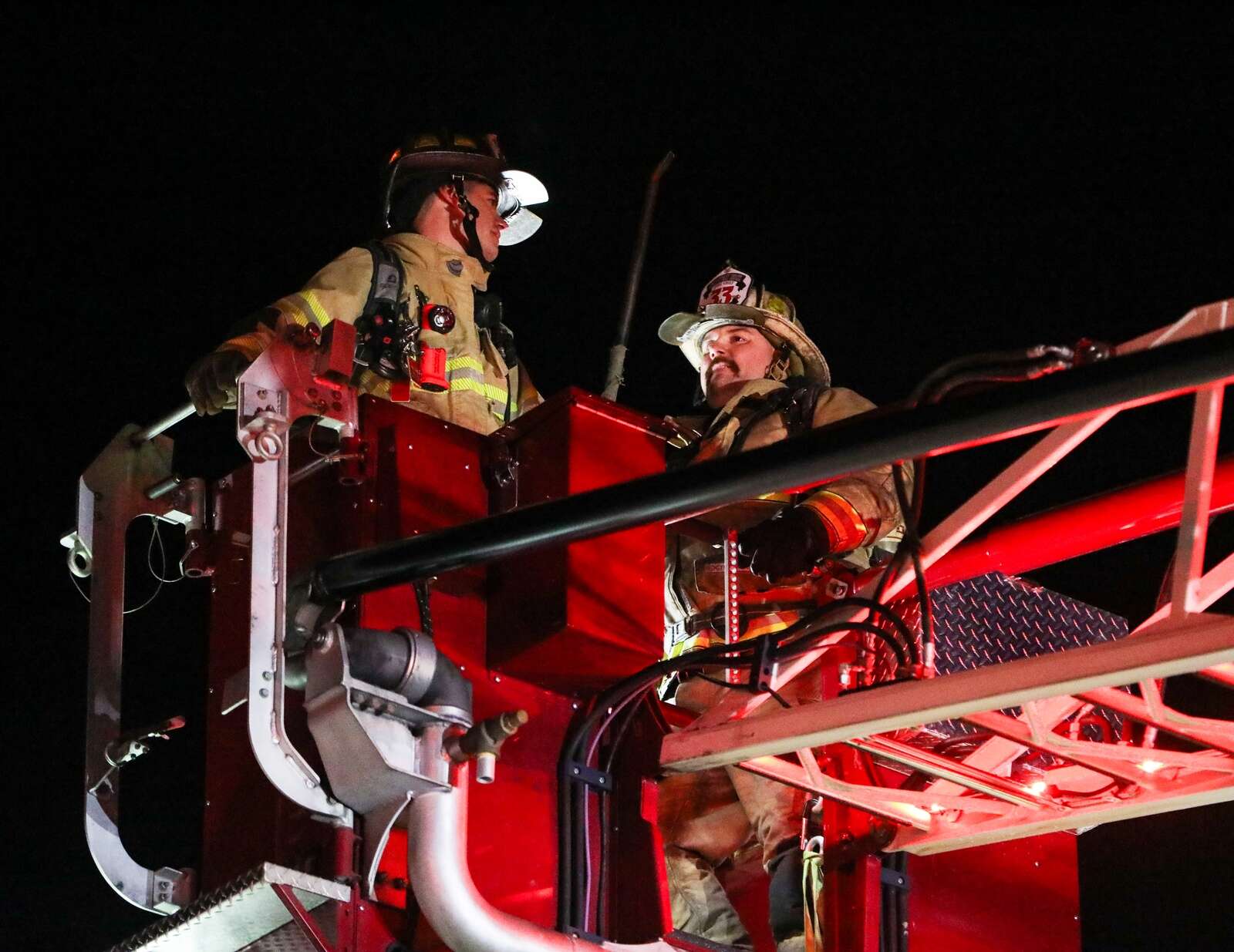 Firefighters wait in the bucket of a fire truck during a fire department training event at Clearview Mall in Butler on Tuesday, Nov. 26. Morgan Phillips/Butler Eagle