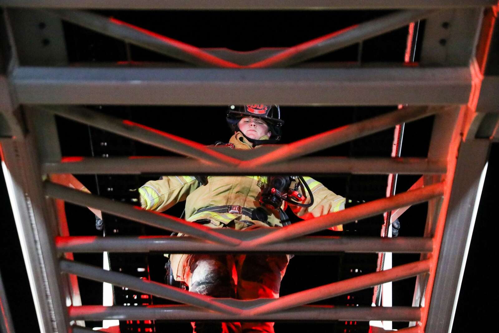 A firefighter comes down the ladder of a firetruck during a fire department training event at Clearview Mall in Butler on Tuesday, Nov. 26. Morgan Phillips/Butler Eagle