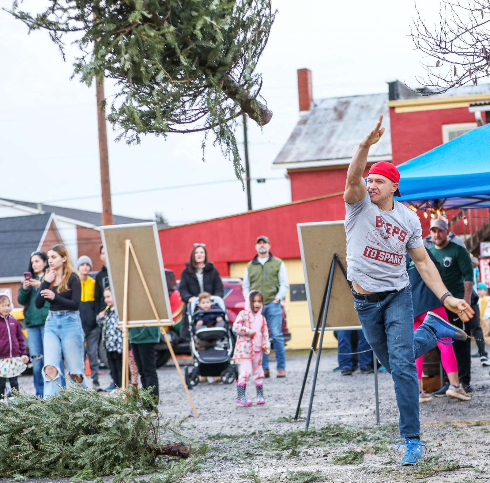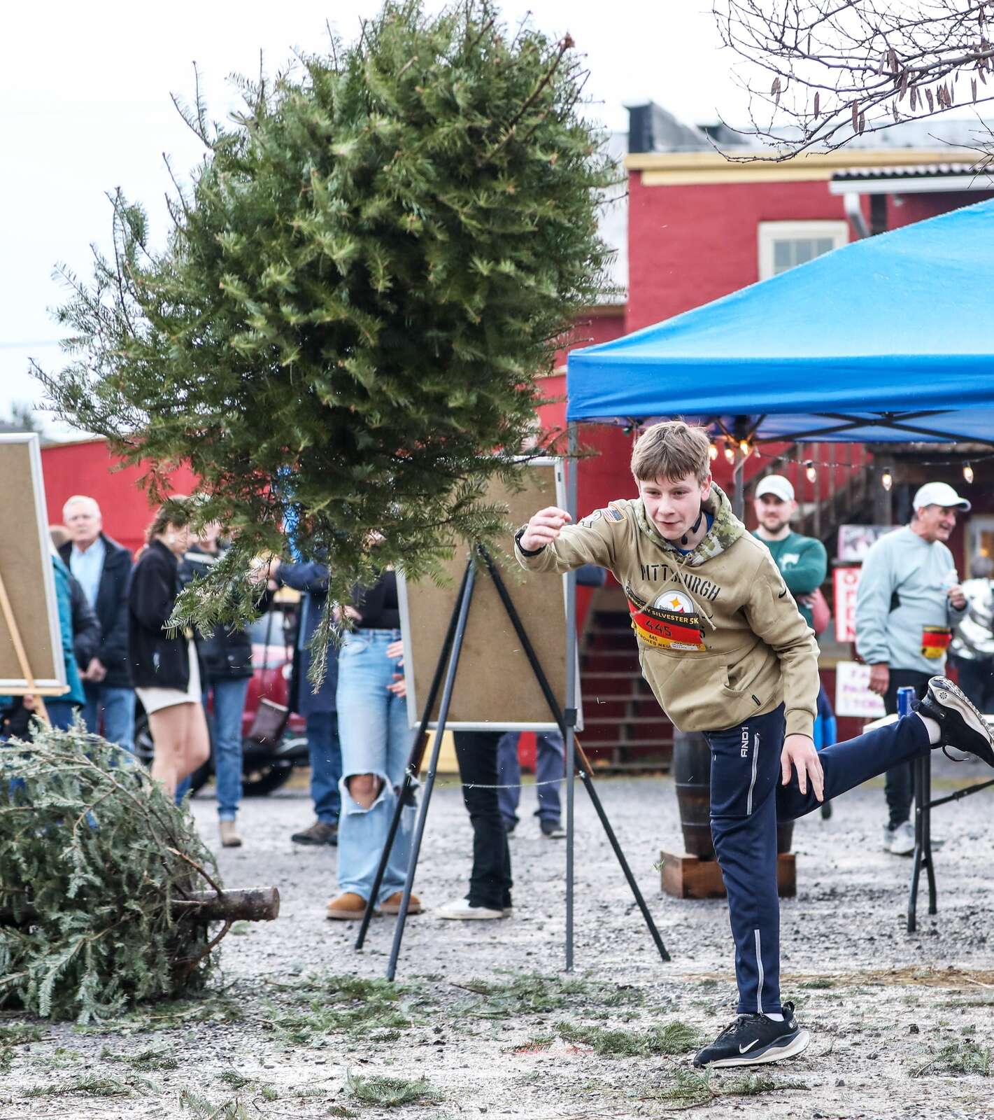 Joshua Hassan participates in Christmas tree throwing during the Harmony Silvester Celebration in Historic Harmony on New Year's Eve on Tuesday, Dec. 31. Morgan Phillips/Butler Eagle