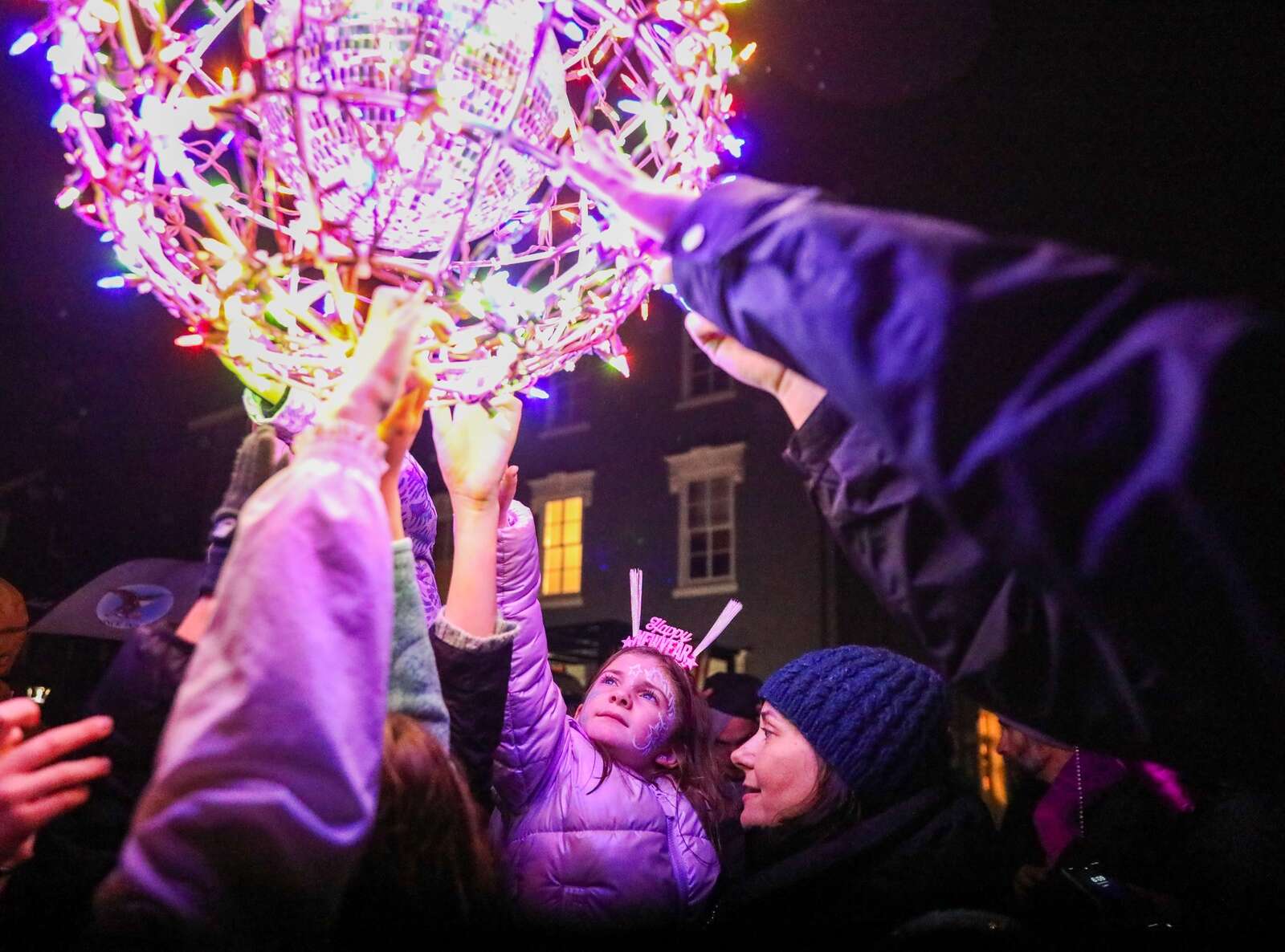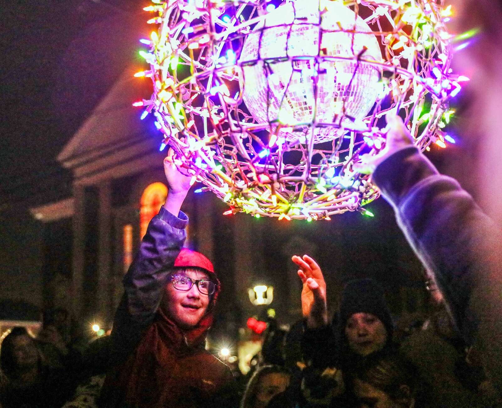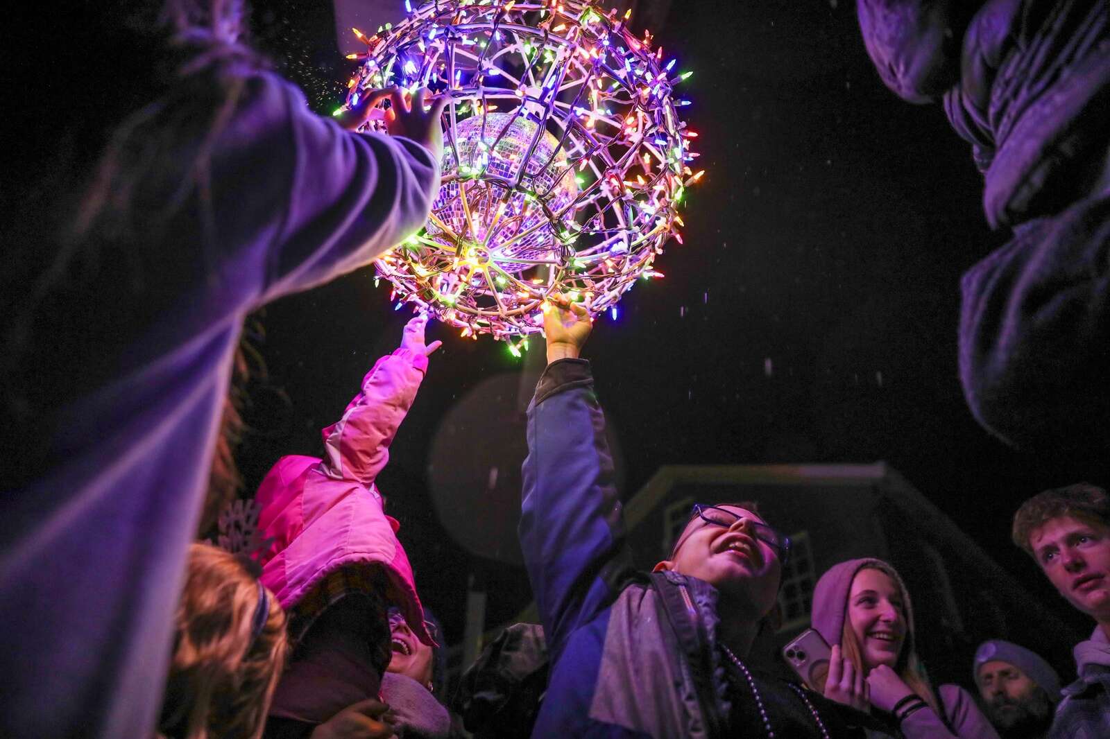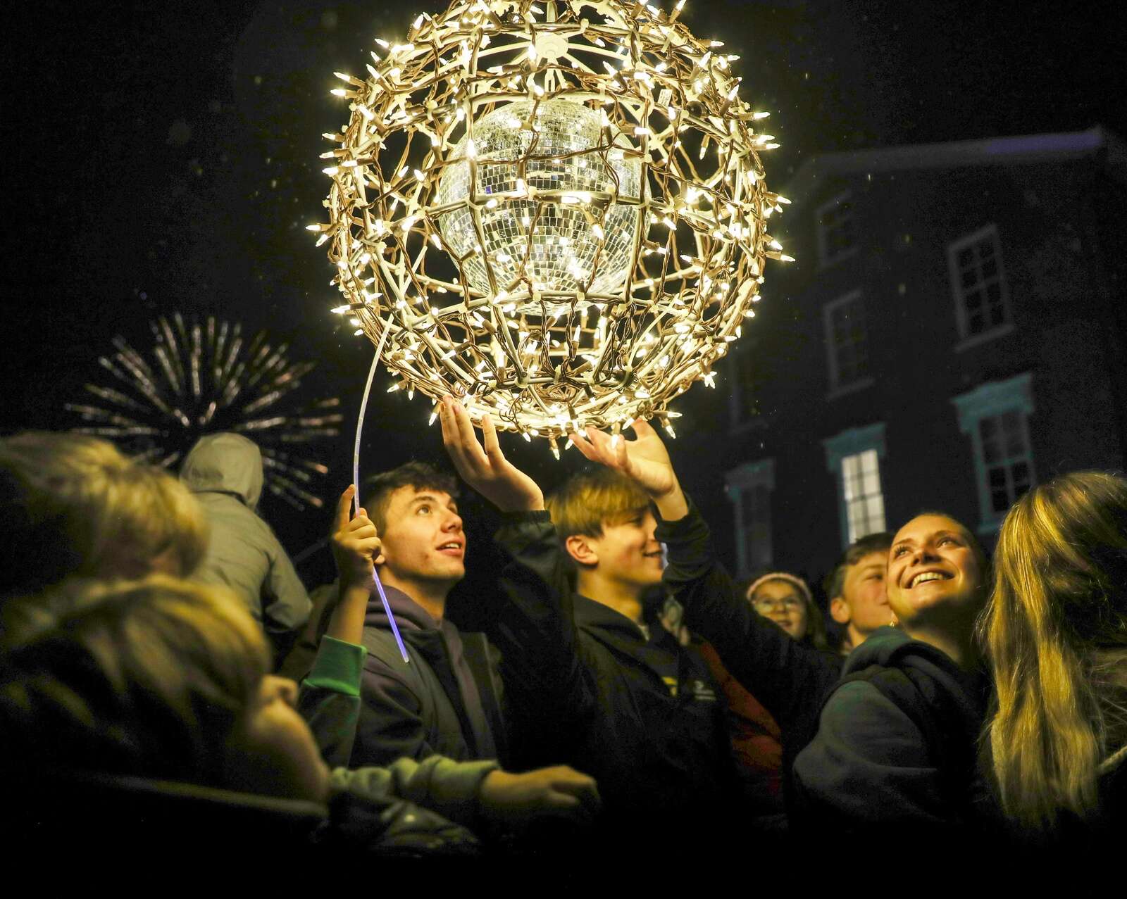 The ball drops as attendees touch it during The Harmony Silvester Celebration in Historic Harmony on New Year's Eve on Tuesday, Dec. 31. Morgan Phillips/Butler Eagle