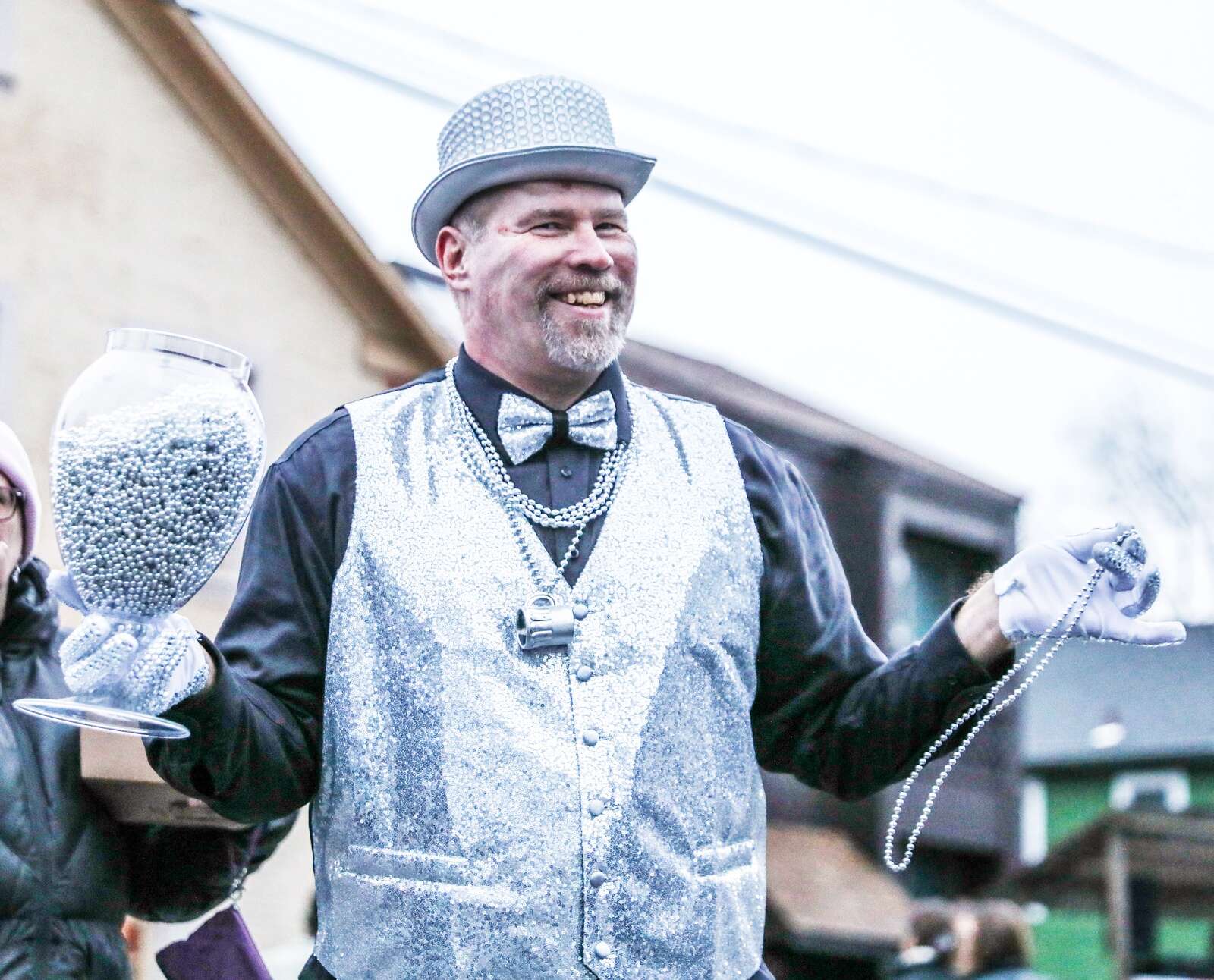 Ryan Salazar hands out silver beads ahead of the ball drop during the Harmony Silvester Celebration in Historic Harmony on New Year's Eve on Tuesday, Dec. 31. Morgan Phillips/Butler Eagle