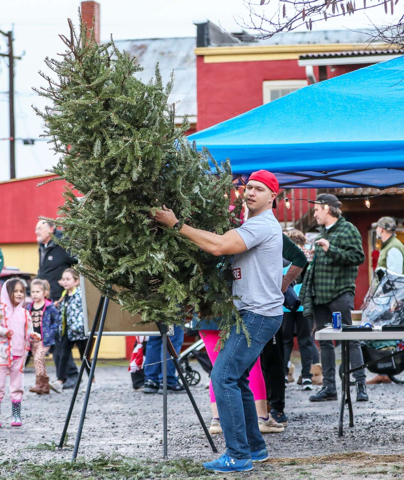Cliff Laschon participates in Christmas tree throwing during The Harmony Silvester Celebration in Historic Harmony on New Year's Eve on Tuesday, Dec. 31. Morgan Phillips/Butler Eagle