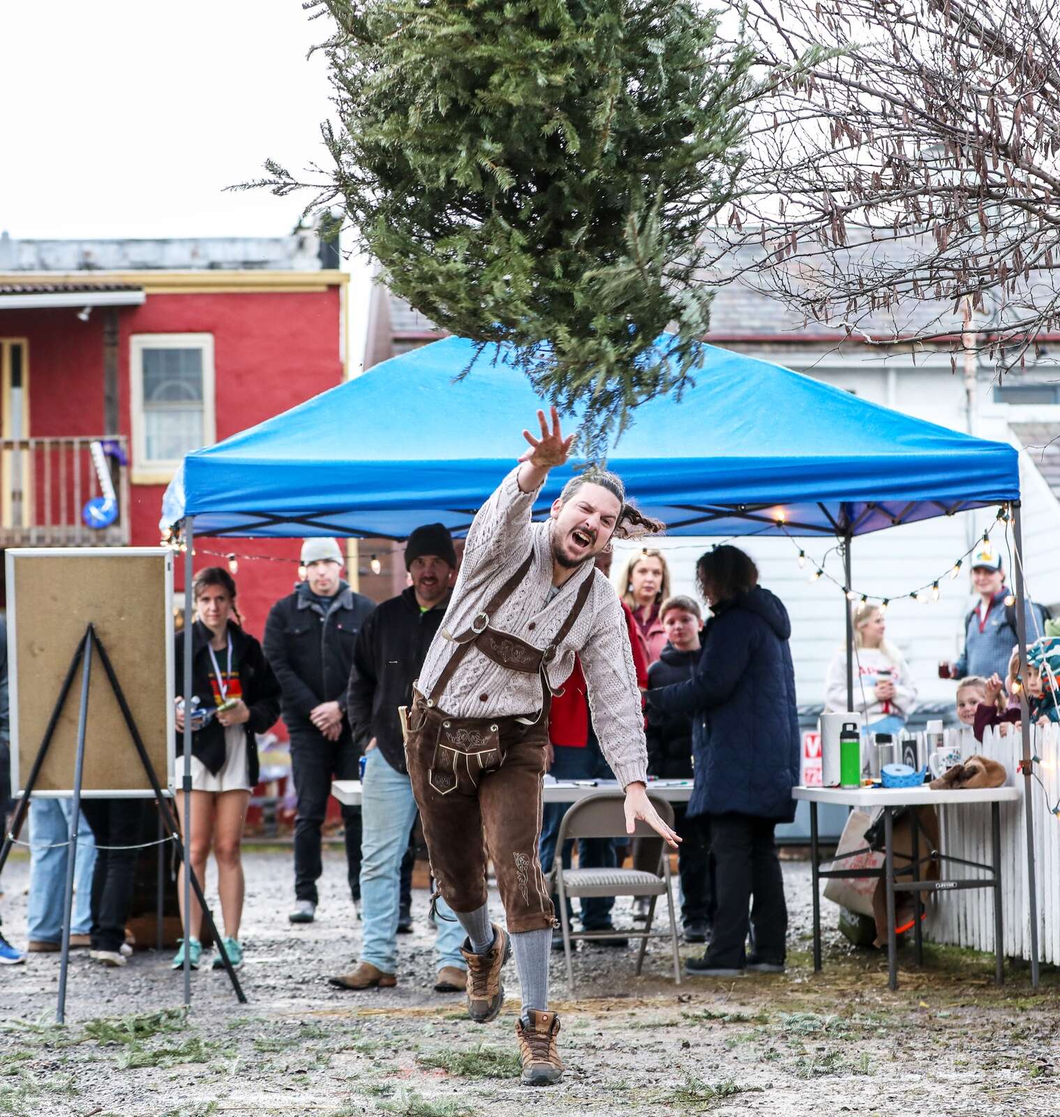 B. Drane participates in Christmas tree throwing during The Harmony Silvester Celebration in Historic Harmony on New Year's Eve on Tuesday, Dec. 31. Morgan Phillips/Butler Eagle