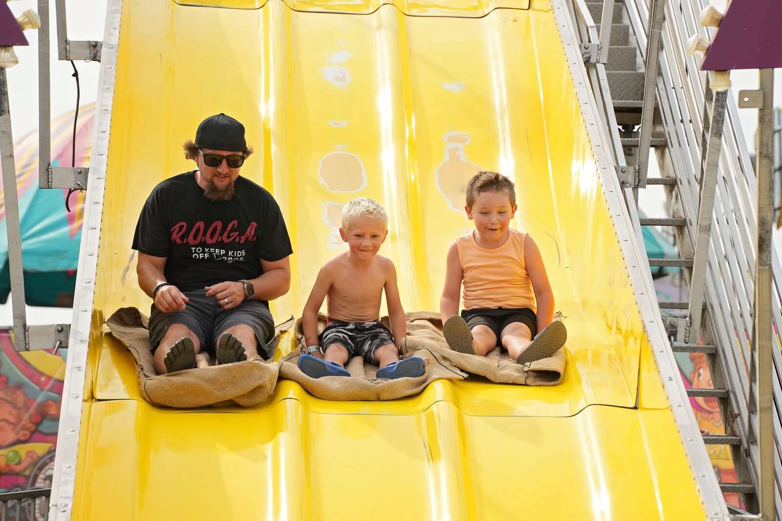 Chris and Racer Zedreck and Isaiah Baker race down the Super Slide at the Butler Farm Show in Connoquenessing Township on Monday, Aug. 5. Holly Mead/Special to the Eagle