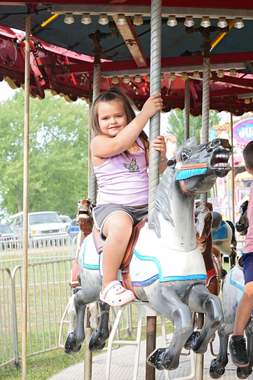 Natalia Valerie, 5, takes a ride on the merry-go-round at the Butler Farm Show on Monday, Aug. 5. Holly Mead/Special to the Eagle