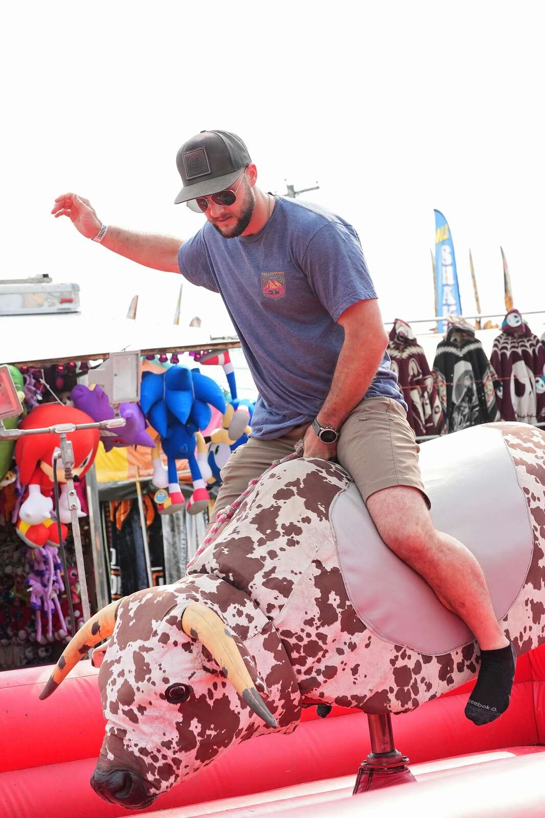 Shaun Mentaberry, a professional bucking horse rider from Texas, takes his turn ona mechanical bull while visiting at the Butler Farm Show in Connoquenessing Township on Monday, Aug. 5. Holly Mead/Special to the Eagle